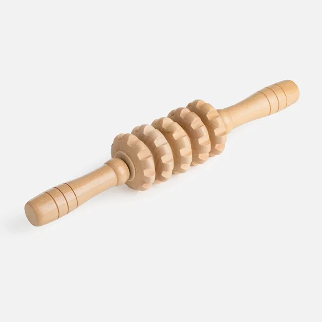 Wooden roller with 5 rotating discs with a textured edge for massage and targeted pressure on tight areas of the back, waist and neck. Helps decompress and relax muscles.