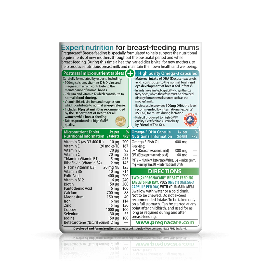 Το Pregnacare Breast-feeding έχει σχεδιαστεί προσεκτικά από ειδικούς, με βασικές βιταμίνες, μέταλλα και DHA, για να βοηθήσει στην υποστήριξη της συνολικής υγείας και ζωτικότητας, συμπεριλαμβανομένου του σιδήρου που συμβάλλει στη φυσιολογική απελευθέρωση ενέργειας.